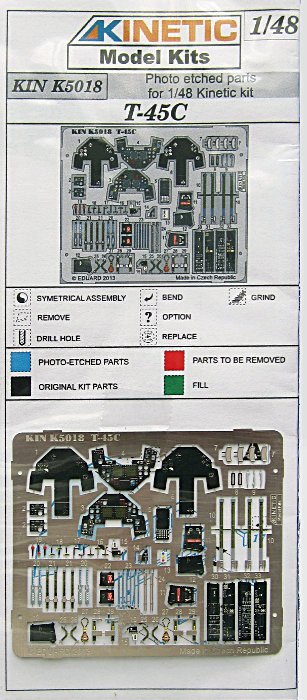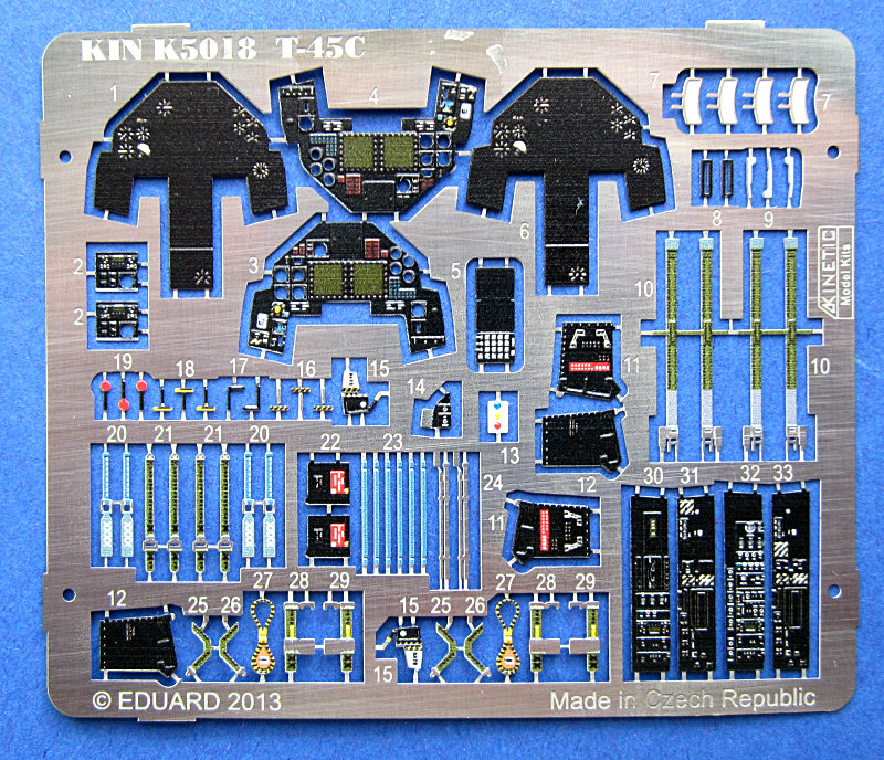 Für den eigenen Bausatz der T-45 Goshawk (First Look) hat Kinetic auch zwei Zubehörsätze herausgebracht. Einen mit den Instrumentenbrettern für die T-45A und einen für die T-45C. Letzteren habe ich erworben. Der etwa 7cm x 5cm große Bogen enthält nur Details für das Cockpit. Neben den im Bausatz fehlenden Gurten gibt es auch Instrumentenbretter und Seitenkonsolen, einschließlich diverser Hebel. Auch die Schleudersitze bekommen etwas mehr Details.