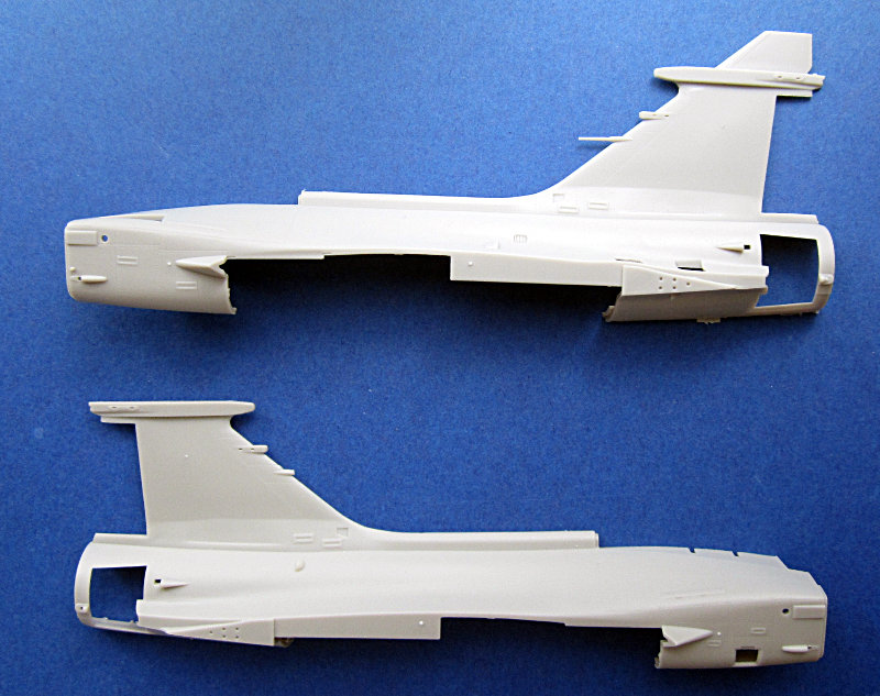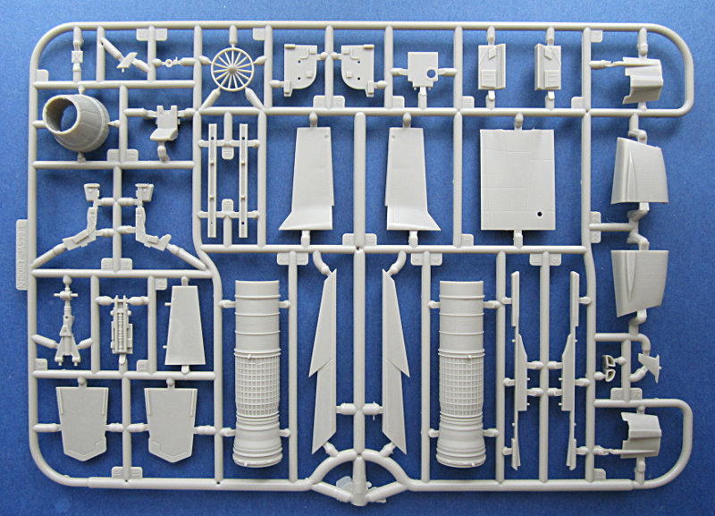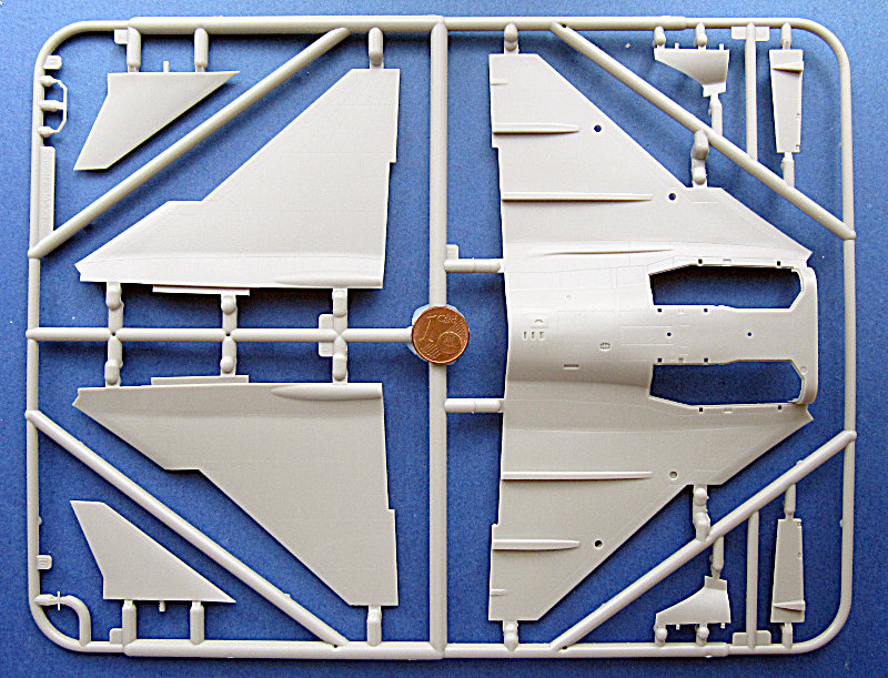 Das Cockpit und die Fahrwerkschächte sind ganz gut detailliert, jedoch dürfte der Zubehörsektor hier Einiges mehr bieten können. Die Schubdüse ist auf der Außenseite gut detaillert, davon sieht man später jedoch nichts mehr. Innen ist das Rohr glatt und zeigt zwei enorme Auswerfer je Hälfte. Ein Teil wird zwar durcht ein Fotoätzteil verdeckt, jedoch wäre es mir umgekehrt - Auswerfer außen - lieber. Daher habe ich mir trotz Vorsatzes das Modell aus dem Kasten zu bauen, den Triebwerksauslass von Aires besorgt. Neben dem Schubrohr ist hier nämlich die Düse besser detailliert, während das Bausatzteil nur einen glatten 1mm breiten Stumpf als Abschluss hat.