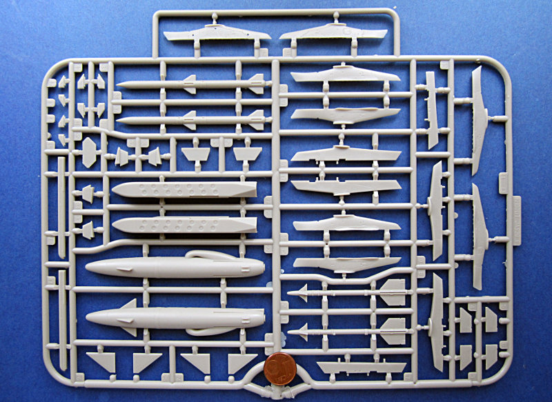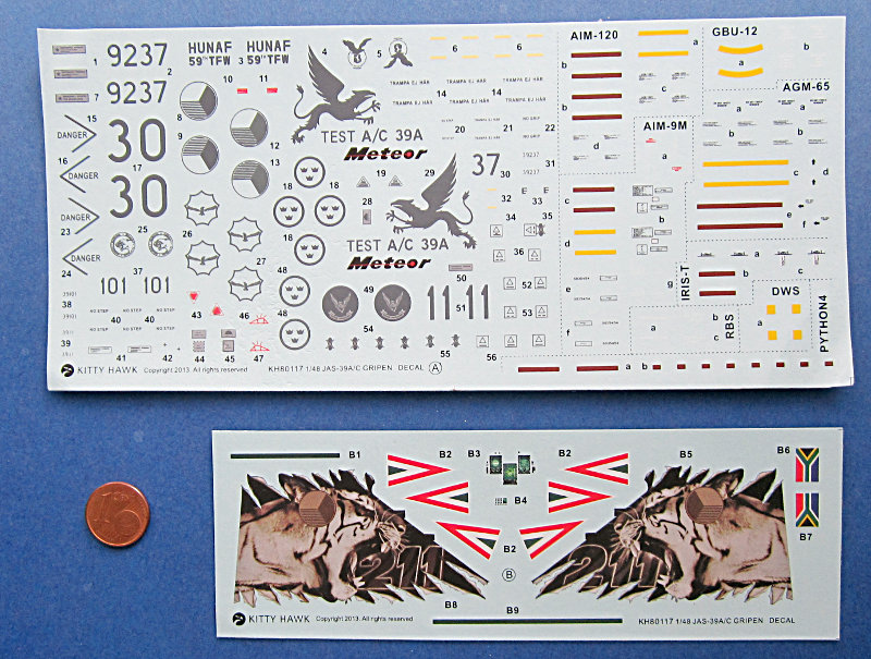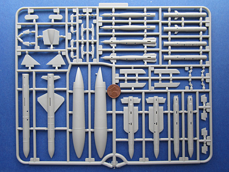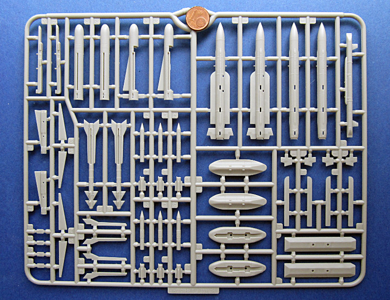 Der kleine Fotoätzteilbogen enthält den schon erwähnten Einsatz für das Schubrohr, Gurte, Rückspiegel und einige Details für das Äußere des Modells. Neben den Teilen zur Konstruktion des Flugzeugs liegen auch recht viele Abwurfwaffen bei. Es gibt AIM-9M, IRIS-T, Python 4, AIM-120 für den Luftkampf und GBU-12, AGM-65, RBS-15F und DWS-39 (TAURUS) für die Luft-Boden-Rolle. Darüber hinaus sind weitere Waffen und ein Tank am Spritzling ME/MF (aus der Mirage F.1 von KittyHawk) enthalten, die in der Bauanleitung jedoch keine Erwähnung finden. Die Bemalung der Waffen und die Anbringung der Abziehbilder wir auf einer separaten farbigen Seite der Bauanleitung dargestellt. Die Ladeoptionen sind ebenfalls in der Bauanleitung abgebildet, allerdings sollte man hier für sein Vorbild recherchieren! Leider fehlen die oft zusehenden Zusatztanks.