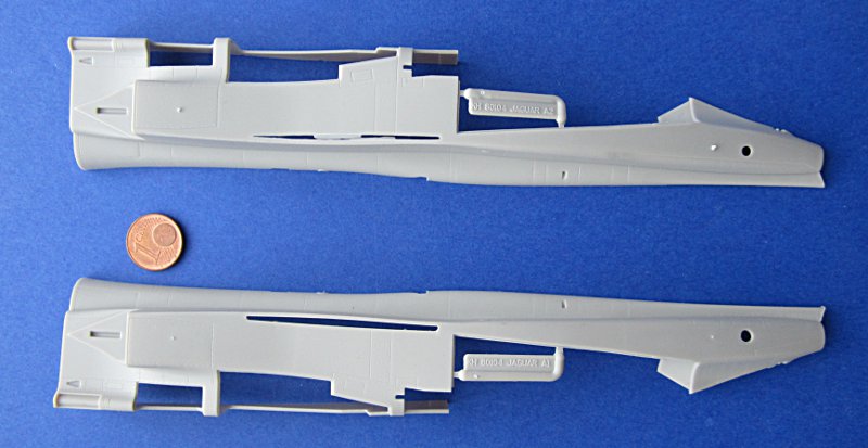 Die gesamte Vorderrumpfsektion mit Cockpit ist ansonsten hervorragend umgesetzt, besonders im Fall der beiden Schleudersitze (Martin Baker Mk 4 und Mk9- nur engl. Version!). Sorgfalt ist natürlich oberstes Gebot, wenn der Vorderrumpf mit dem Zentralrumpf vermählt wird. Dieser wiederum ist mit seinen zahlreichen Einbauten wie dem Hauptfahrwerk, den Triebwerken , den Kanonenverschlüssen und den Lufteinläufen sehr genau auszuführen, d.h., dass Trockenpassungen mehr als angeraten sind. Den Abschluss bildet das Ansetzen der Tragflächen und hier muss ein leichter Versatz durch Abschleifen der Befestigungslaschen beseitigt werden, um einen exakten Übergang zum Rumpf zu erzielen. Reichhaltige Bewaffungen lassen keine Wünsche offen.