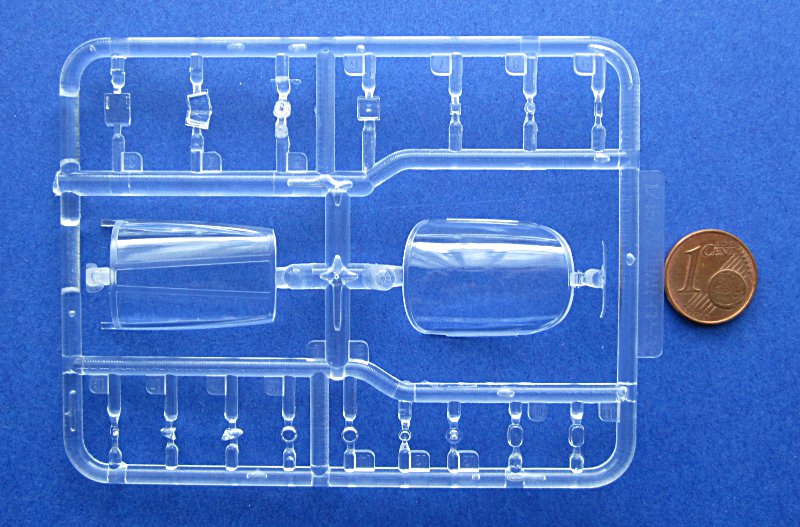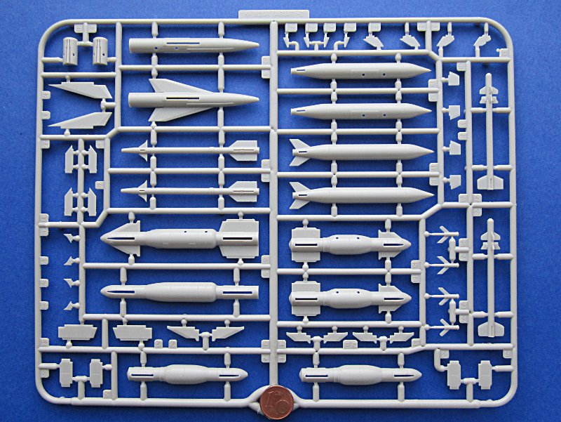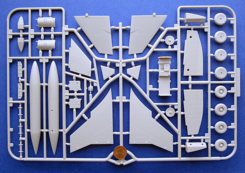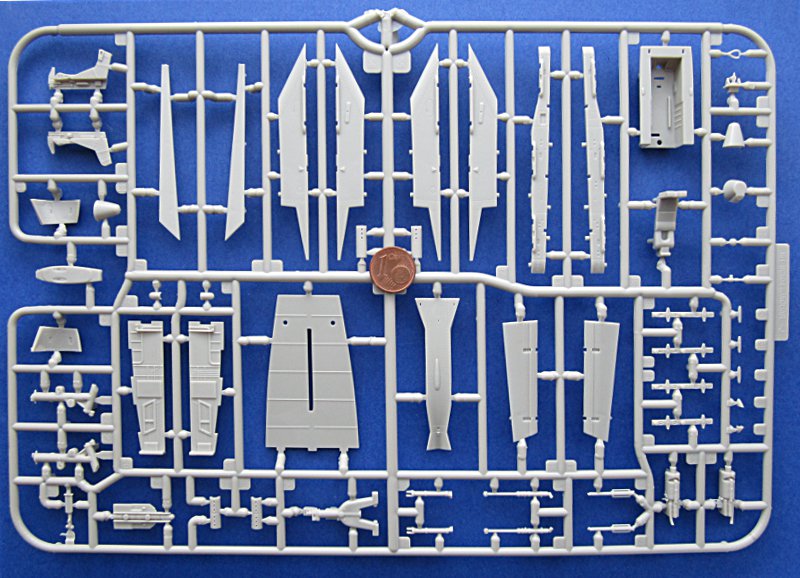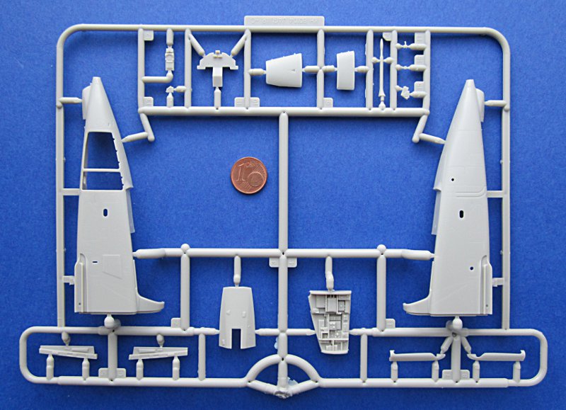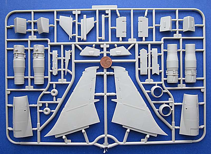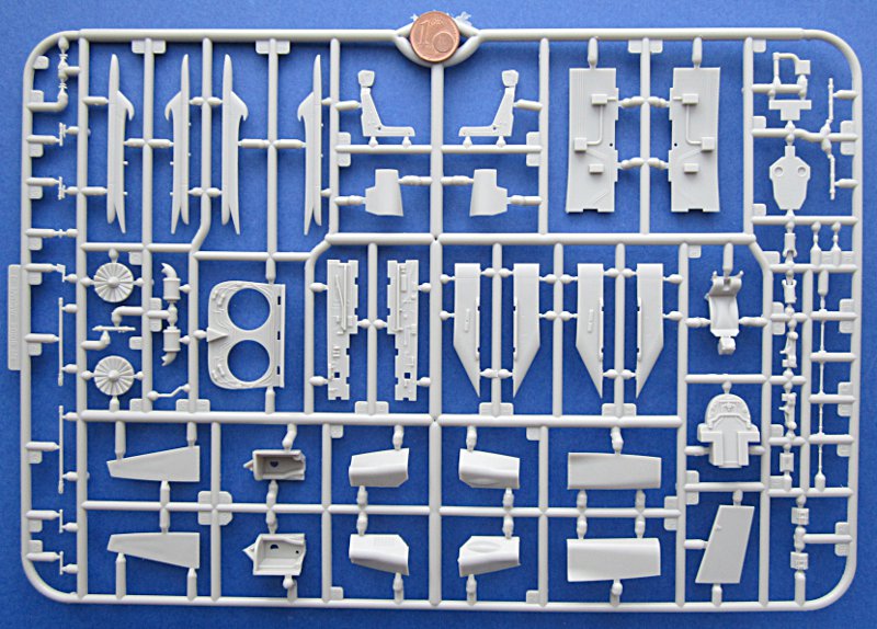 Die Teile sind exakt und gratfrei abgespritzt. Die glatte Oberfläche zeigt feine versenkte Gravuren, die nicht übertrieben wirken. Insgesamt ist der Bausatz stark zergliedert, was den zahlreichen Darstellungsmöglichkeiten geschuldet ist, aber der Passgenauigkeit insgesamt nicht schadet, vorausgesetzt, man arbeitet entsprechend sorgfältig. Sind separate Vorflügel, Landeklappen, Querruder und Spoiler heute schon Standard, so lassen sich bei diesem Bausatz zusätzlich der Avionikbereich, die Bordkanone und die beiden Triebwerke geöffnet darstellen. Die Bauvielfalt hat aber z.B. im Cockpitbereich meines Erachtens eine Schattenseite, da das Instrumentenbrett durch ein mäßig detailliertes Fotoätzteil wiedergegeben wird. Spritzgussteile herkömmlicher Art können hier mehr überzeugen und sind leichter farblich zu gestalten.