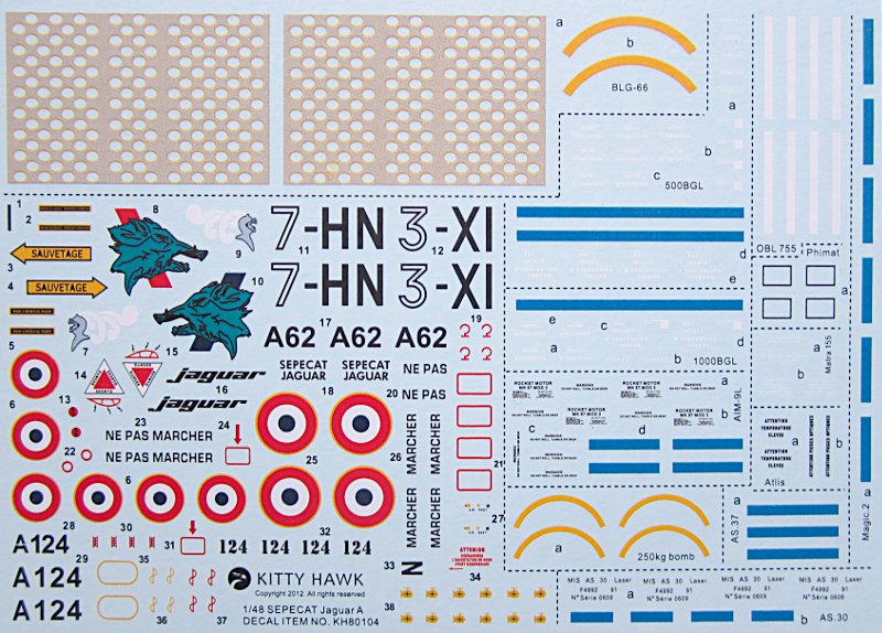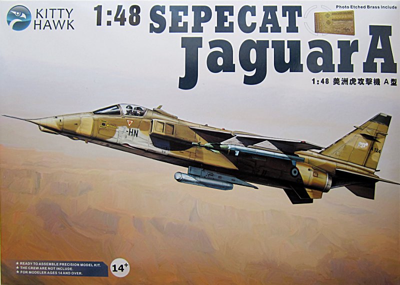 Bausatz: Nachdem die 48er Bausätze von Heller bzw. Airfix schon deutlich betagt sind, war die Erwartung an den Kit des neuen chinesischen Herstellers KITTY HAWK natürlich groß. Eine Überraschung war der unerwartet kleine, aber ansprechend gestaltete, Stülpkarton (21x30x7cm), in dem man schwerlich einen kompletten Jaguarrumpf erwarten konnte. Neben den sieben Spritzgussrahmen, den Klarsichtteilen, einer Fotoätzplatine und den exakt gedruckten Abziehbildern, fanden sich zwei separate Rumpfschalen, deren Vorderteile in die Gussrahmen integriert war und somit passten alle Teile in den kleinen Karton. Hier ist klar ersichtlich, dass wohl der Doppelsitzer nicht mehr lange auf sich warten lässt.
