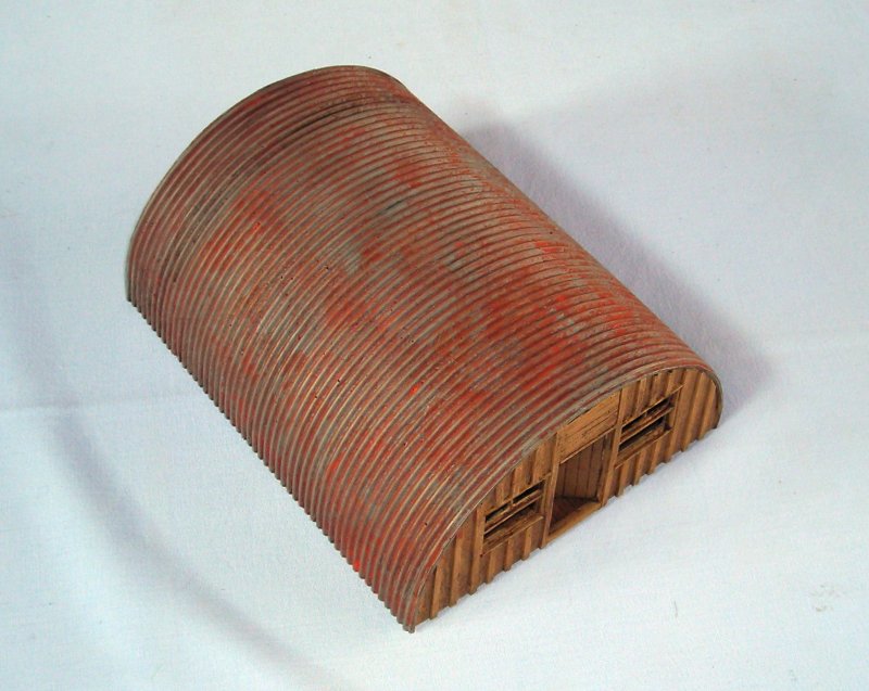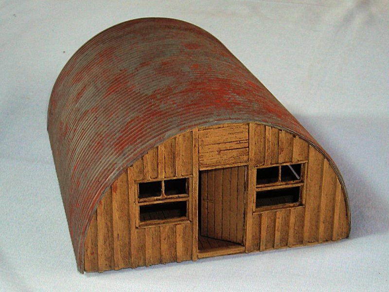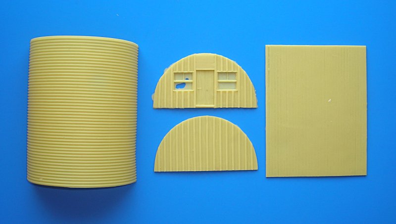 Hier möchte ich die Nissenhütte im Maßstab 1/48 vorstellen. Vier Resinteile bilden diese Hütte. Vorder-, Rückseite und Boden zeigen eine schöne Holzstruktur und wirken wie unter Kriegsbedingungen zusammen genagelt. Das Dach weist eine überzeugende Wellblech-Struktur auf. Die Front muss unbedingt von hinten dünner geschliffen werden, um die Fenster freizulegen. Alternativ kann man natürlich auch eine Darstellung mit Zeitungspapier verschlossener Fenster probieren. Auch das Öffnen der Tür ist denkbar. Der Phantasie sind da kaum Grenzen gesetzt.