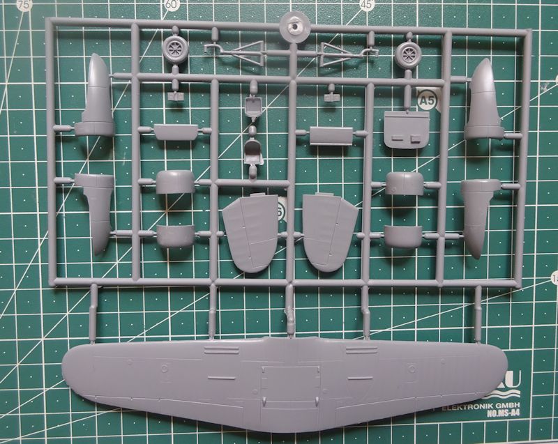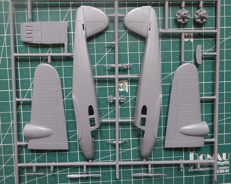 Die sauber abgespritzten Teile haben feine versenkte Strukturen, auch die Stoffteile kommen gut rüber. In den ersten Bauschritten wird das Hauptfahrwerk in die Tragflächen eingebaut. Anschließend folgen die Motorgondeln, das Brandschott mit aufgeprägtem Motor und die zweiteilige Motorverkleidungen. Die Luftschrauben sind aus einem Stück.
