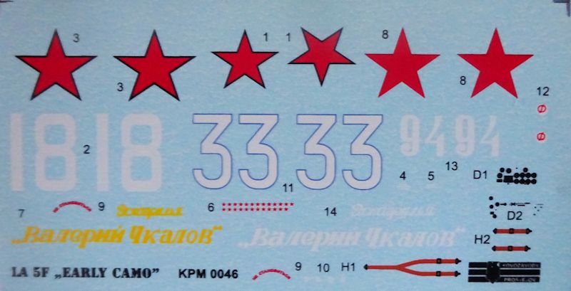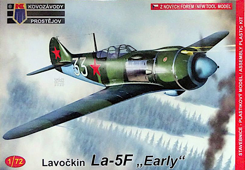 Bausatz: Bisher gab es die La-5F nur von AML jetzt vervollständigt KP seine Modellserie damit. Der Firmenphilosophie entsprechend gibt es mehrere Auflagen mit unterschiedlicher Deko. Der attraktive, aber unpraktische Faltkarton enthält drei graue und einen klaren Spritzling, Abziehbilder sowie eine Bauanleitung.