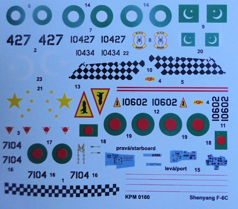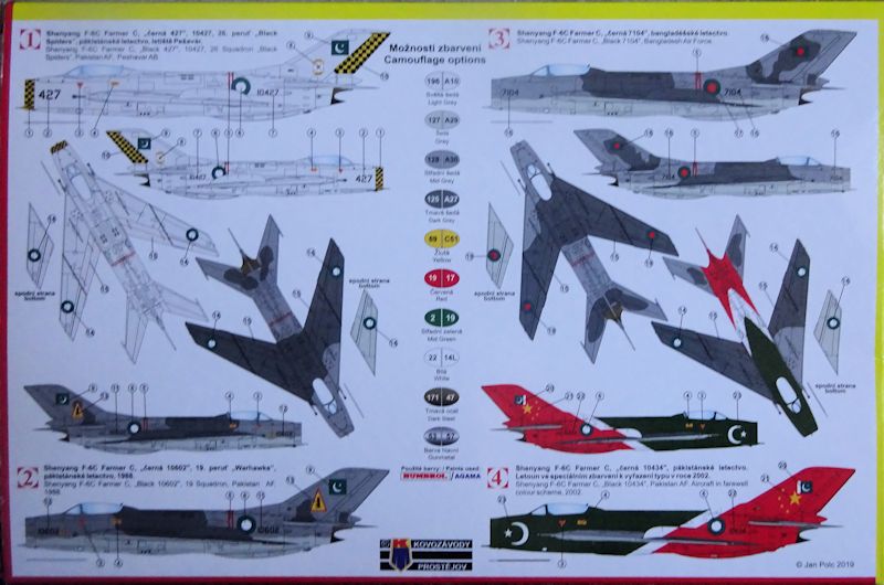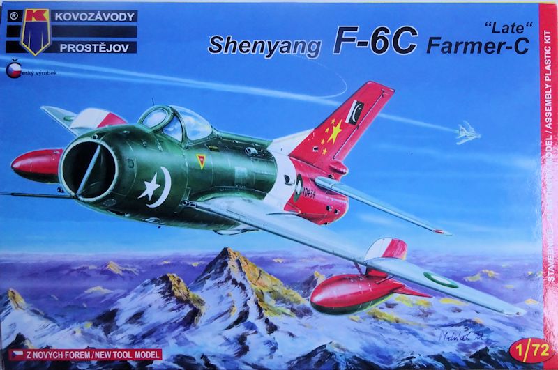 Bausatz: Dem KP-Modell von 1972 folgte wenig später das von Heller, die bis 2000 auch von anderen Anbietern wiederaufgelegt wurden. Die shortrun Serie MiG-19S/PM von Bilek verschwand rasch vom Markt. Die auf diesen Modellen beruhenden Shenyang boten nur die ersten Lizenausführungen und nicht die interessanteren chinesischen Änderungen. Jetzt hat der Erstanbieter wieder zugeschlagen und eine Shenyang F-6 aus neuer Form vorgelegt. Die typische gelb-rote Faltschachtel enthält zwei graue Gussäste mit ca. 100 Teilen, wozu auch die typenspezifischen für die chinesische Ausführung gehören. Dazu gibt es noch ein Klarsichtteil, Abziehbilder und eine einfache Bauanleitung.