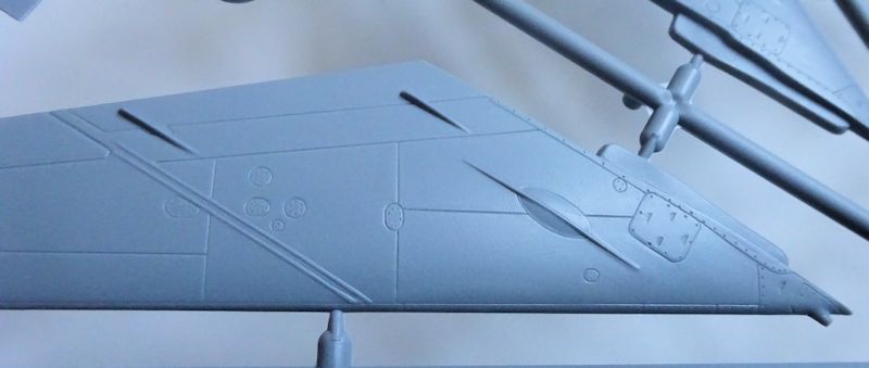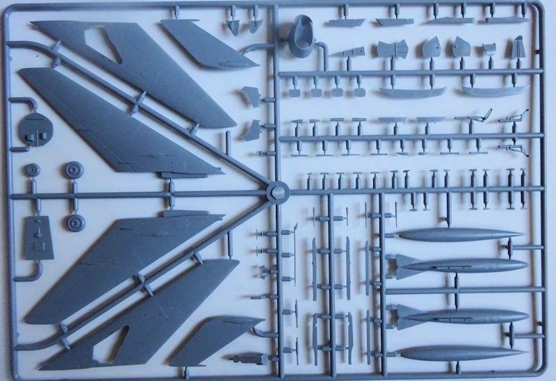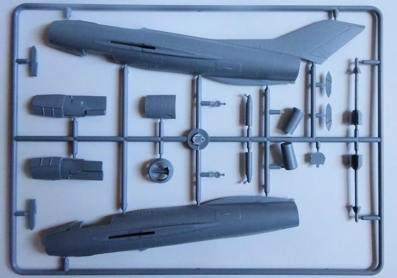 Die großen Teile tragen saubere Gravuren. Seitenleitwerk und Stabilisatoren haben scharfe Hinterkanten, die großen Tragflächen nicht. Das Heckteil für die beiden Triebwerke liegt als ein Teil bei. Die das Erscheinungsbild der MiG-19 prägenden Lufthutzen machen einen Großteil der Kleinteile aus und sind eine kleine Herausforderung bei der Montage. Bei den kleinen Teilen finden wir auch das Notwendige für die F-6.