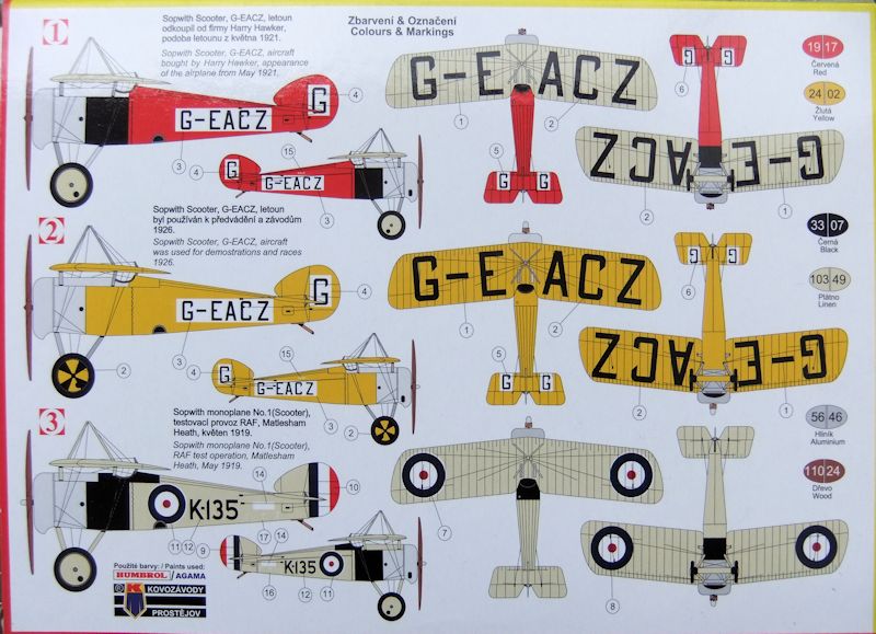 Bemalung: Die Hauptattraktivität der kleinen Maschine entwickelt sich aus den drei Bemalungsvorschlägen, welche auf der Rückseite des Kartons prangen. Die Rote "Scooter" ist die besagte Maschine von Harry Hawker, Mai 1921. Das gelbe Flugzeug flog 1926 Rennen und demonstrierte ihr Können auf Flugschauen. Dann gibt es noch eine Testmaschine der Royal Air Force aus Matlesham Heath. Der Hauptanstrich sollte in Beige erfolgen. Die Bauanleitung ist einfach aber übersichtlich und klar.