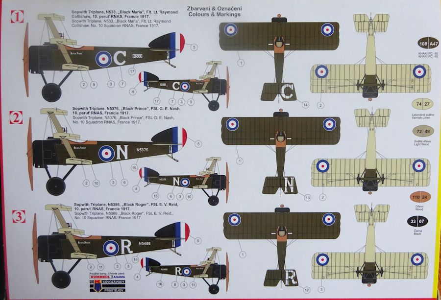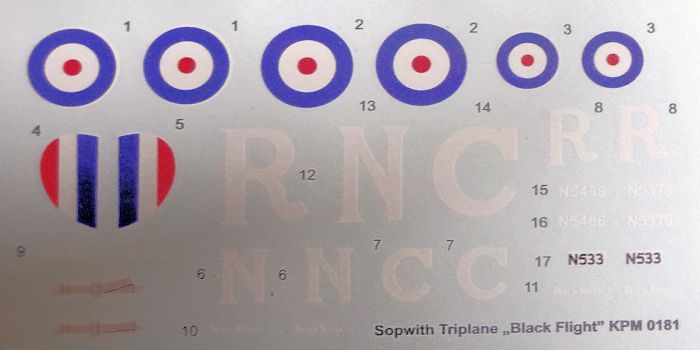 Bauanleitung/ Bemalung: Die Bauanleitung führt in 15 Schritten durch den Bau. Sie zeigt die Bemalung der Kleinteile schon farbig. Der sauber gedruckte Abziehbilderbogen liefert Material für drei Maschinen des sog. Black flight der No.10 Sqn des RNAS.