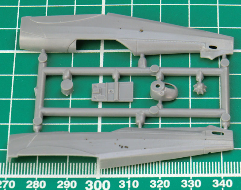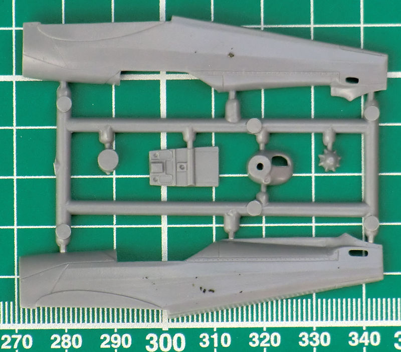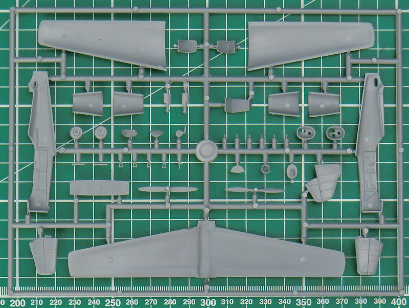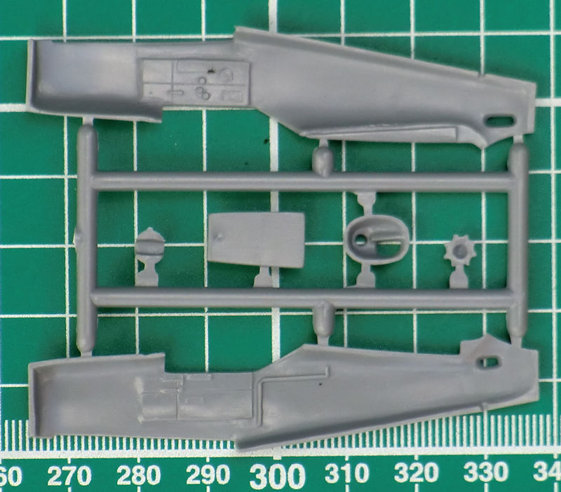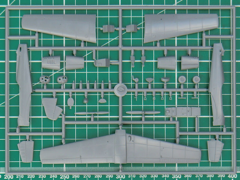 Hinter dem Lufteinlauf für den Motor hat man den ersten Zylinder angedeutet. Einen kleinen Bock gibt es beim Hauptfahrwerk. Hier muss das Fahrwerksbein (Teil 26) um einen Millimeter gekürzt werden. Seiten- und Höhenleitwerk haben scharfe Hinterkanten. Leider besteht die Cockpithaube nur aus einem Stück.