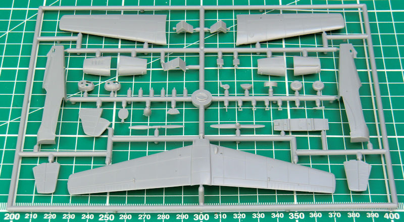 In der attraktiven aber unpraktischen Schüttbox befinden sich gut verpackt zwei graue Spritzlinge mit 49 Teilen, eine Klarsichtkanzel, zwei Decalbögen und die mehrfarbige Bau- und Bemalungsanleitung. Ein paar Teile sind für andere Versionen der Zlin 26er-Reihe. Die Abspritzung ist voll auf der Höhe der Zeit. Es gibt feine versenkte Strukturen und aber auch sehr kleine Teile.