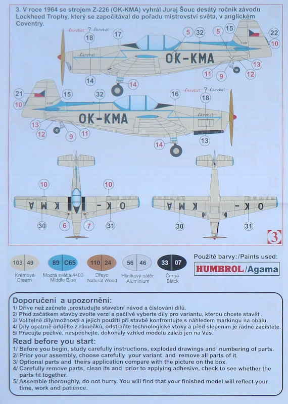 Vorbild: Die Zlin Z-226 ist ein direktes Nachfolgemuster der Zlin Z-126. Sie unterschied sich insbesondere durch den stärkeren 6-Zylinder-Reihenmotor Walter Minor 6-III vom Vorgänger. Der erste Prototyp flog 1955 und der Serienbau folgte darauf.