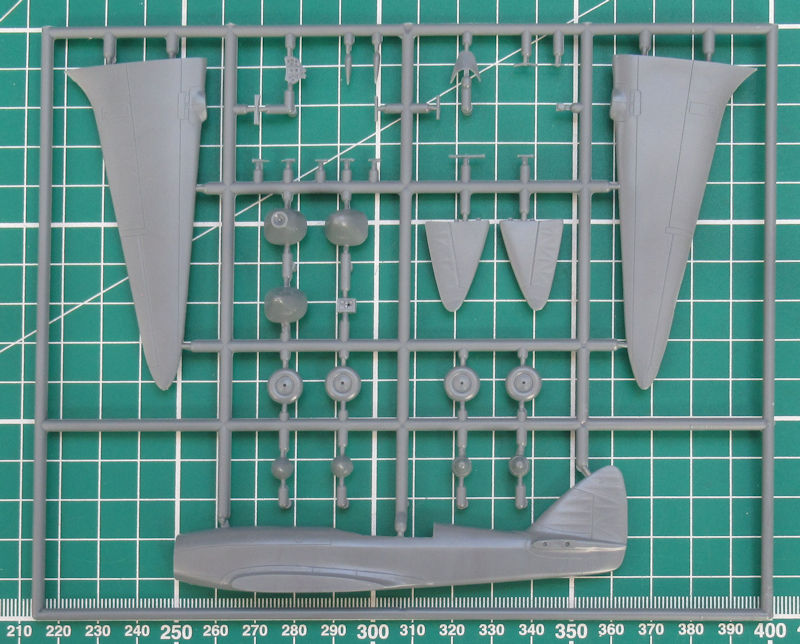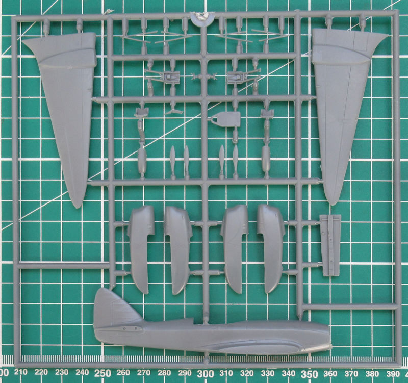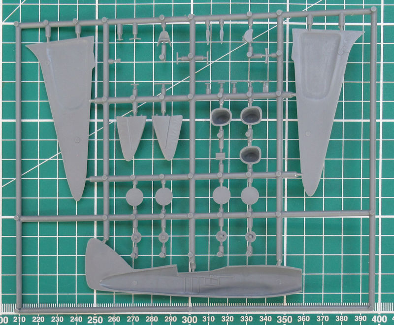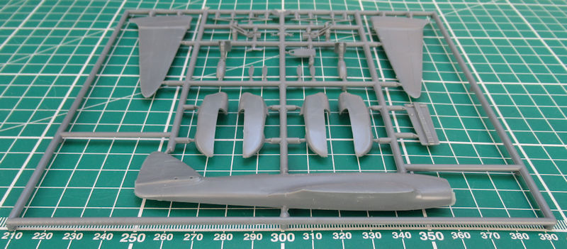 In der attraktiven aber unpraktischen Schüttbox befinden sich sehr gut verpackt zwei graue Spritzgussrahmen mit 60 Einzelteilen, zwei Klarsichtteile, ein Decalbogen und die mehrfarbige Bauanleitung. Die Bauteile haben feine versenkte Strukturen und die Oberfläche sieht sehr realistisch aus. Man kann auch die Kleinteile als solche bezeichnen, denn sie sind sehr filigran.
