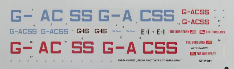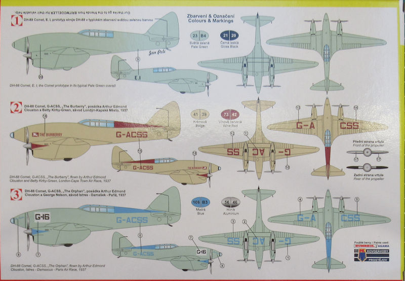 Bausatz: Airfix brachte schon in den Anfangstagen des Plasitmodellbaus einen Bausatz der DH-88 in 1/72 heraus. Dieser ist nach wie vor erhältlich und für Einsteiger geeignet. Dann folgte SBS 2015 mit einem Resinbausatz für fortgeschrittenen Modellbauer. Dieser ist nun durch den KP-Spritzgusskit überholt.