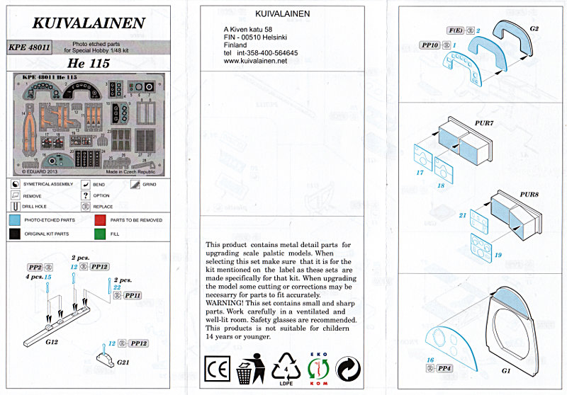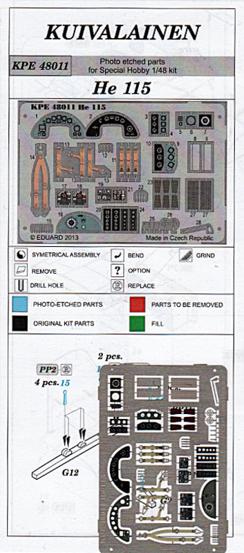 Die Firma Kuivalainen ist mir bisher nur ab und an bei Hannants im Neuheitenblock aufgefallen. Scheinbar ist dies ein finnischer Shop, der einige Produkte in Auftragsprouktion fertigen lässt. Der hier vorgestellte Satz liefert eine ganze Reihe von Details für die He 115 von Special Hobby. Der Ätzteilsatz wurde von Eduard hergestellt und hat Zoom-Ausmaße.