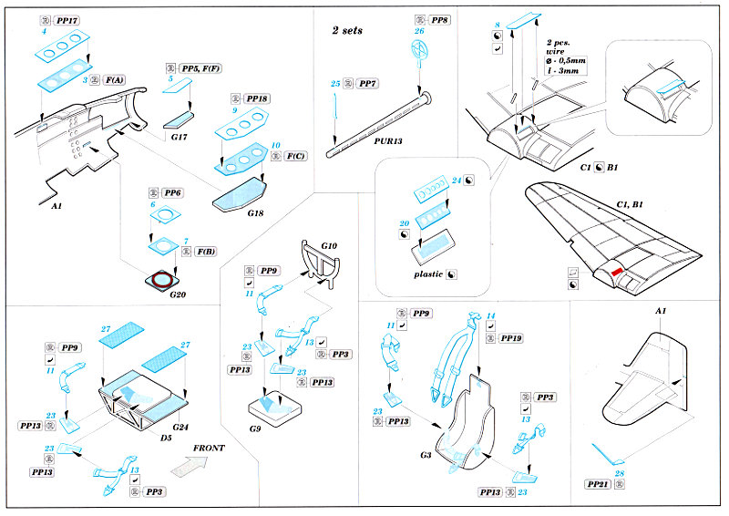 Auf dem Bogen sind natürlich bedruckte Gurte und Instrumentenbretter enthalten. Dazu gibt es weitere Details für das Cockpit und einige Außendetails. Der wichtigste Aspekt ist sicher die Bereitstellung von Motorinstrumenten samt Blendschutz. Diese wurden von Special Hobby nicht nachgebildet und können mit diesem Satz sehr schön dargestellt werden.