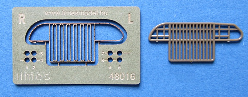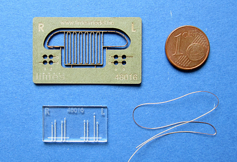 Das Teil ist sauber ausgeschnitten und sehr viel filigraner als das Bausatzteil. Dies muss man auch beim Umgang damit beachten. Zur Stabilisierung habe ich es etwas mit dünnflüssigem Sekundenkleber "eingerieben". Dies ist insbesondere bei den Scheinwerferschutzbügeln von Vorteil. Mit dem Draht für das Gitter tue ich mich etwas schwer. Limes hat hier extra ein Tool für das Ablängen des beiliegenden Drahtes beigefügt. Trotzdem waren bei mir alle Drähte zu kurz. Das Anpassen von Hand ist natürlich etwas langwieriger. Auf dem Karton gibt es auch so etwas wie eine Lehre, aber diese scheint bei mir nicht vollständig gelasert zu sein (es fehlt das Maß für die horizontalen Streben, was auf Bildern im Netz zu erkennen ist).