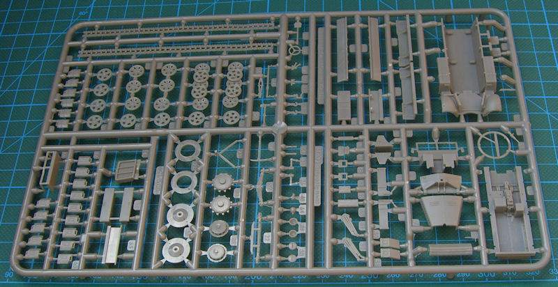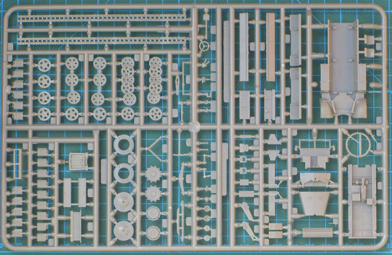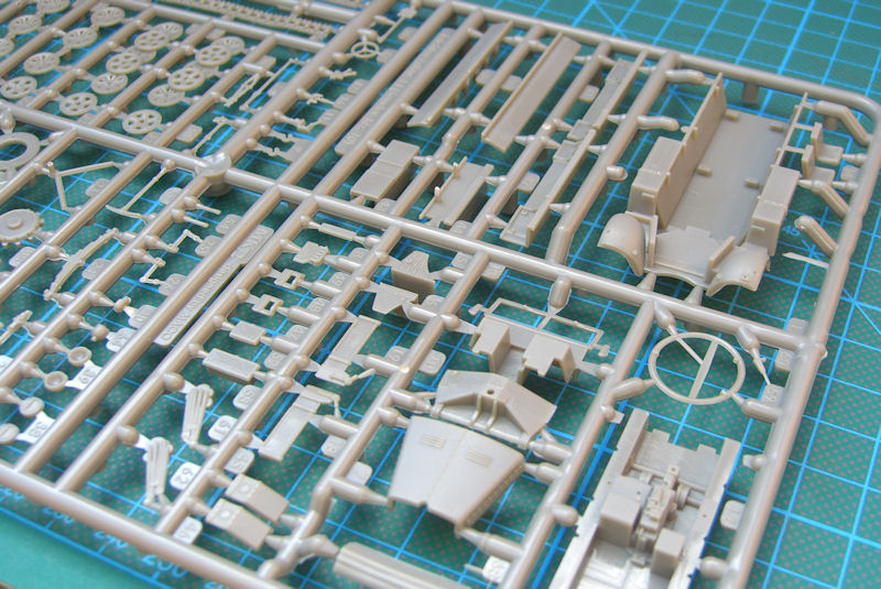 In der attraktiven Schüttbox befinden sich gut verpackt die übersichtliche Bauanleitung, ein kleiner Decalbogen, eine Folie für die Frontverglasung und ein Spritzgussrahmen mit 96 Einzelteilen. Letztere sind sauber ohne Grat abgespritzt. Es scheint sich hierbei um eine Stahlform zu handeln. Selbst die Kleinteile wie Lenkrad und das Bordwerkzeug sind gut und fein abgespritzt. Etwas ungewöhnlich ist die einteilige Kette, die selbst gebogen und gekürzt werden muss.