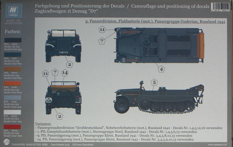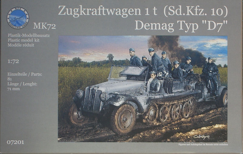 Vorbild: Der leichte Zugkraftwagen 1t entstand bei DEMAG. Er wurde von 1938 bis 1944 in einer Stückzahl von ca. 17500 Exemplaren gebaut. Bei den deutschen Streitkräften wurde das Sd.Kfz. 10 als Zugfahrzeug für die 3,7 cm, 5 cm PaK sowie der 2 cm Flak und des 7,5 cm Infanteriegeschützes eingesetzt. Später kam noch der Einsatz in der Nebelwerfertruppe hinzu und dort wurden alle Varianten gezogen.
