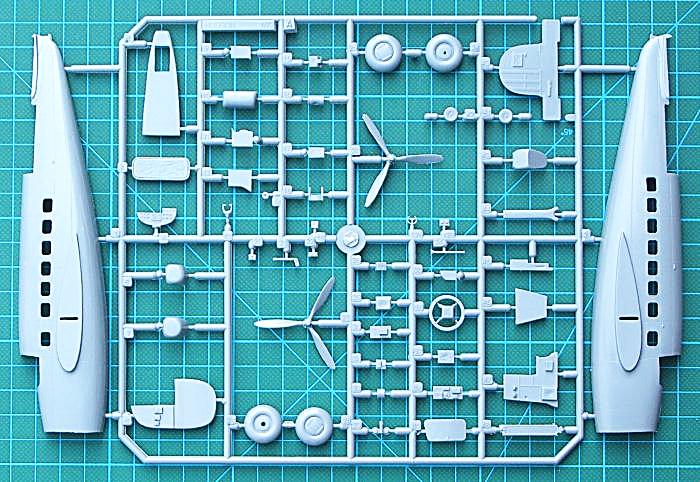 Bausatz: Seit Jahren ist die "Hudson" bei MPM angekündigt. Nun erschien die Mk. I/II. In meinem Bausatz waren die Spritzgussteile noch recht ölig. Weiterhin sind auch Spritzgussteile für andere Versionen enthalten. Auch der geschlossene Rumpfbug der "Super Electra" ist dabei. Der Bausatz enthält keinerlei Resin- oder Fotoätzteile. Die fünf hellgrauen Spritzrahmen sind nicht frei von Grat. Die Klarsichtteile sind schön klar und dünn. Leider sollen die Seitenscheiben plan eingesetzt werden. Mal sehen, wie MPM die Passung optimiert hat.