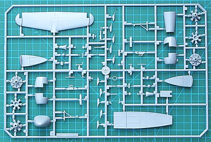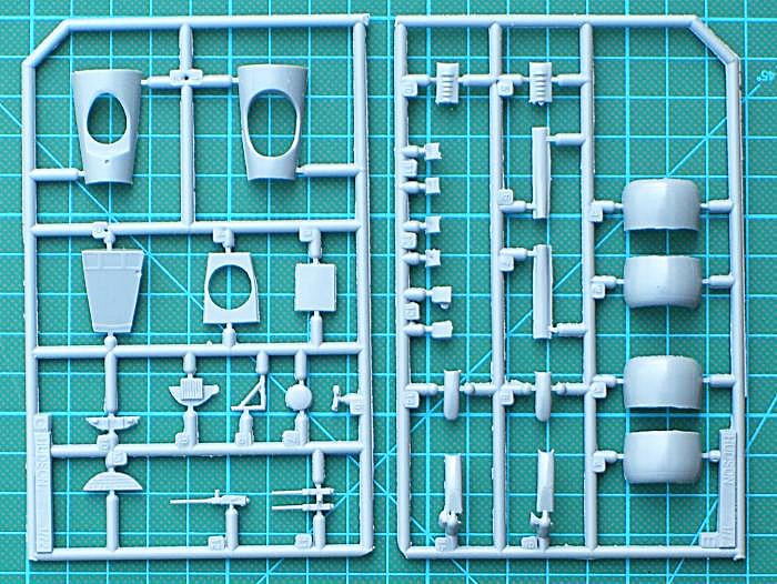 Das Cockpit hat eine Basisausstattung und sollte noch mit Gurten aufgewertet werden. Sicher werden von CMK oder auch Eduard diverse Zurüstsets erscheinen, denn immerhin sind die späten Versionen bei Italeri angekündigt. Im Rumpf müssen noch zwei Öffnungen geschnitten werden - eine für die Astrokuppel und eine weitere für die Tür. Die Rumpfinnenseiten sind strukturiert und für eine bessere Stabilität gibt es einen Holm. Auch hat die Hauptkabine eine Ausstattung. Die Kleinteile sind doch sehr rustikal und sollten ersetzt werden. Die zuverwendenen Motore bestehen nur aus einem Relief. Immerhin gibt es noch hilfreiche Skizzen, die die Montage erleichtern. Die Decals sind hochglänzend gedruckt.