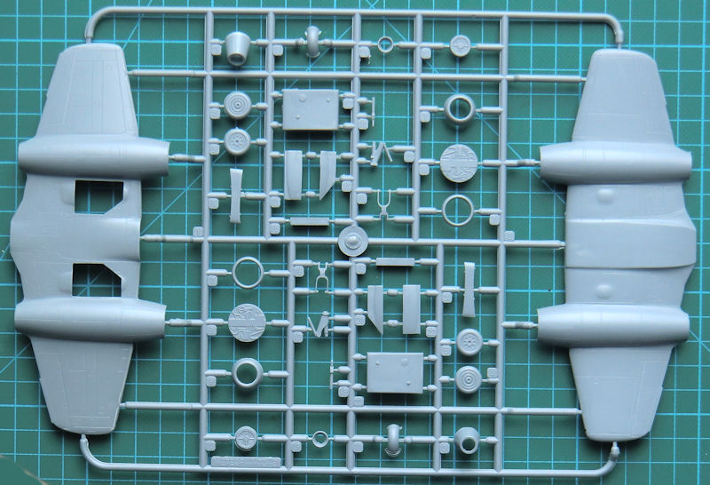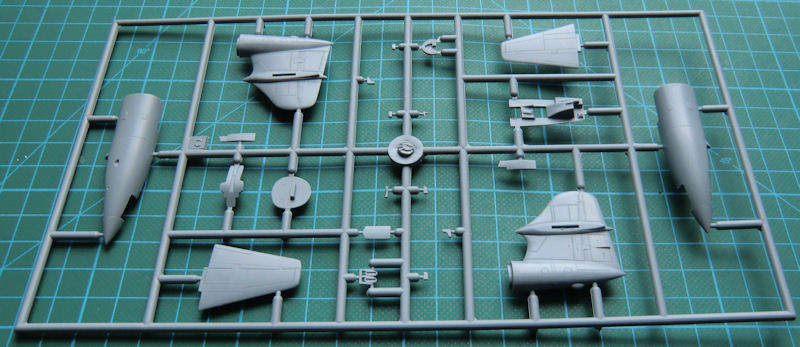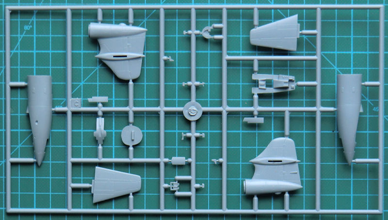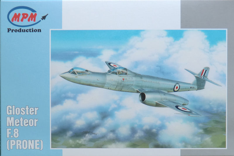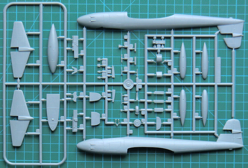Bausatz: MPM modifiziert hier den bekannten Bausatz der Gloster Meteor F. 8 in 1/72 und fügt ein paar weitere neue Bauteile hinzu. Interessant ist für mich auch das Leitwerk der Meteor Mk. 12. In dem stabilen Stülpkarton befinden sich gut verpackt drei graue Spritzlinge mit 98 Teilen, drei Klarsichtrahmen mit acht Teilen, die Bauanleitung und ein Decalbogen. Die Masse der Short-Run-Bauteile ist bekannt. Nur der kleine Spritzrahmen mit den Teilen für Bug und Seitenleitwerk ist neu. Dazu kommen natürlich die entsprechenden Klarsichtteile.