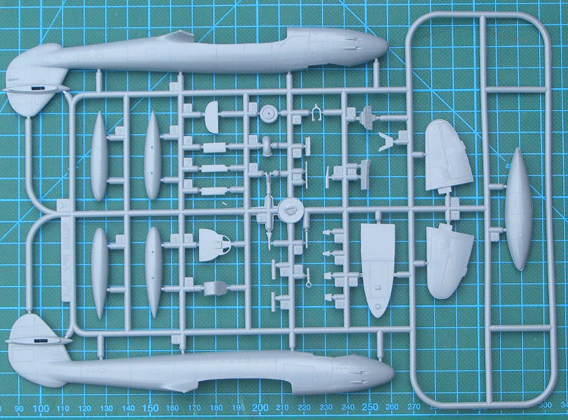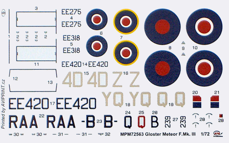 Bausatz: MPM hatte mit den Versionen 8/9 eine Reihe von Bausätzen im Maßstab 1/72 begonnen. Hier gibt es nach der Meteor Mk. 4 mit kurzen Flügel die Mk. III mit der ursprünglichen Fläche.