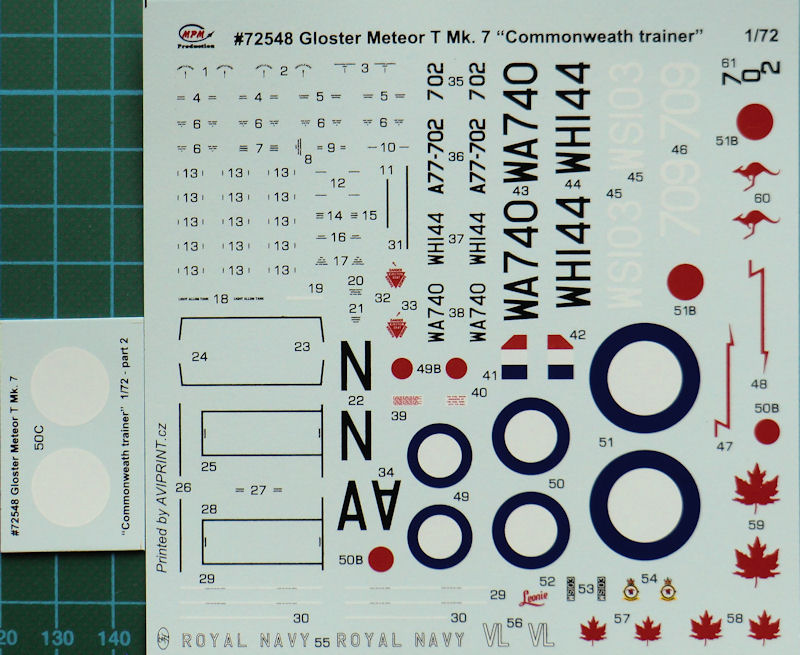 Vorbild: Die Gloster Metor T Mk. 7 war ein auf der Mk. 4 basierender zweisitziger Trainer. Als erstes wurde eine beschädigte Vorführmaschine zum Doppelsitzer umgebaut und diese hatte dann ihren zweiten Erstflug am 19. März 1948. Die Anregung kam durch einen Auftrag von Argentinien. Die wollten 100 Maschinen kaufen und benötigten auch die Ausbildung. So entwickelte Gloster lieber noch ein doppelsitziges Schulflugzeug.