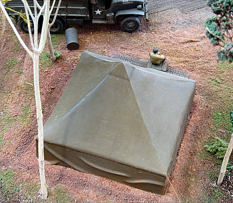 Marc hat das Modell für ein bestimmtes Diorama (siehe unten) designed und deshalb eine Drainage anmodelliert. Zukünftig wird es auch andere Zeltformen geben. Als Luftwaffenfan werde ich vesuchen diesen Wulst etwas zu verstecken. Als Lösungsansatz habe ich mir überlegt, das Zelt etwas in den Untergrund zu versenken und ringsherum einen kleinen Sandsackwall anzumodellieren.