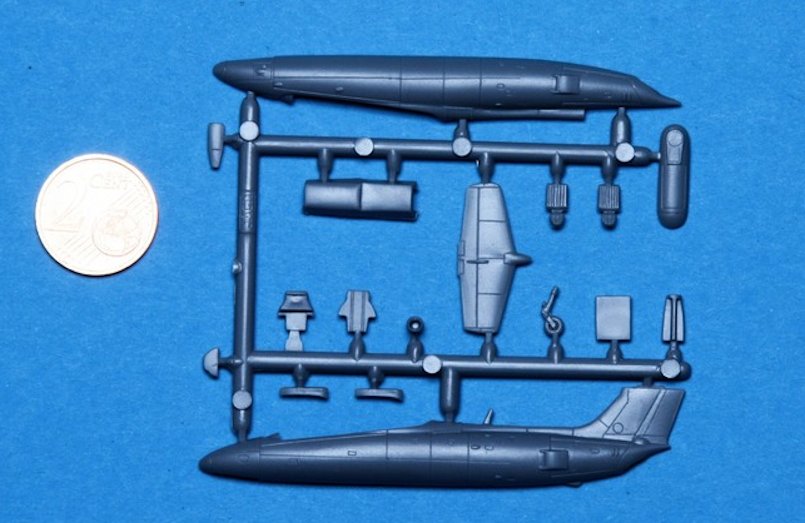 Die beiden Flügel werden durch die jeweiligen Oberteile komplettiert. Dadurch entstehen ein ausreichend tiefer Lufteinlauf sowie die beiden Hauptfahrwerkschächte. Die Tragflächen sollen stumpf an den Rumpf geklebt werden. Zur Positionierung kann man sich nur an den Gravurlinien sowie der Zeichnung in der Bauanleitung orientieren. Dies stellt schon eine gewisse Herausforderung dar, um am Ende ein gerades Modell zu erhalten. Aus meiner Erfahrung beim Bau der Delfin muss ich aber sagen, dass die Passgenauigkeit sehr gut ist. Auch der Rumpf stellt trotz fehlender Passstifte kein Problem dar. Komplettiert wird das Modell am Ende mit einem gut Fahrwerk und den je nach Version verwendeten Zusatzbehältern oder Abwurfwaffen. Die Cockpithaube ist sauber und klar gegossen, die Verstrebung ist sehr gut erkennbar, was die Lackierung erleichtert.