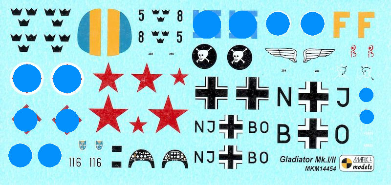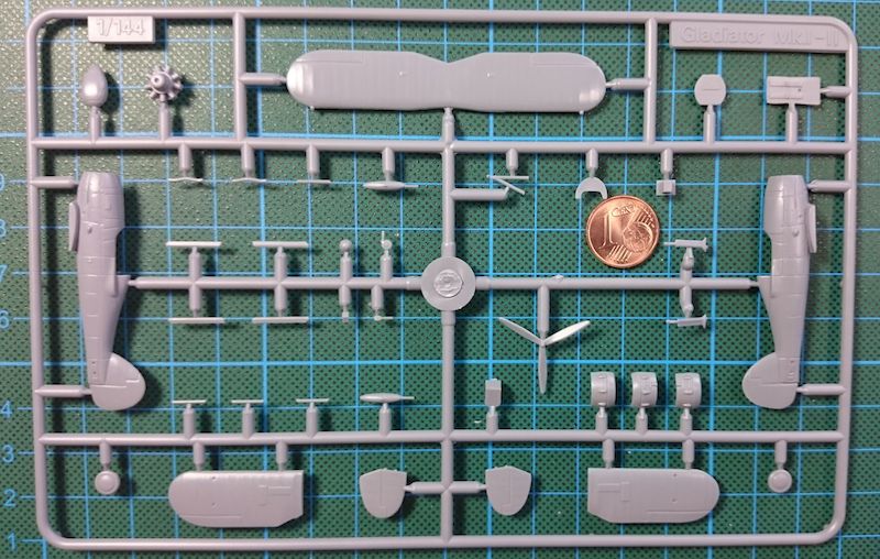 Vorbild: Die Gloster Gladiator war das letzte als Doppeldecker ausgelegte Jagdflugzeug der Royal Air Force und bildete den Abschluss einer langen Entwicklungsreihe von erfolgreichen Doppeldeckerkonstruktionen des Herstellers Gloster Aircraft Company. Die Gladiator flog zuerst im September 1934 und wurde bei der Royal Air Force im Januar 1937 eingeführt. Die Konstruktion der Gladiator zeigte noch einige für Doppeldecker typische Merkmale: verstrebte und verspannte Tragflächen, einen stoffbespannten Rumpf und ein festes Fahrwerk. Fortschrittlicher waren das geschlossene Cockpit und hydraulische Landeklappen. Die Gladiator war bereits vor Beginn des Zweiten Weltkriegs den als Eindecker ausgelegten moderneren Jagdflugzeugen unterlegen. Im Zweiten Weltkrieg kam es jedoch noch zu einzelnen Begegnungen zwischen der Gladiator und anderen Doppeldeckermustern. Die hier vorliegende Version MK.I hatte als Motor eine 627 kW-Version eines Bristol Mercury IX luftgekühlten Sternmotor. Gebaut wurden 1937-38 378 Exemplare dieser Version.