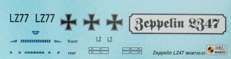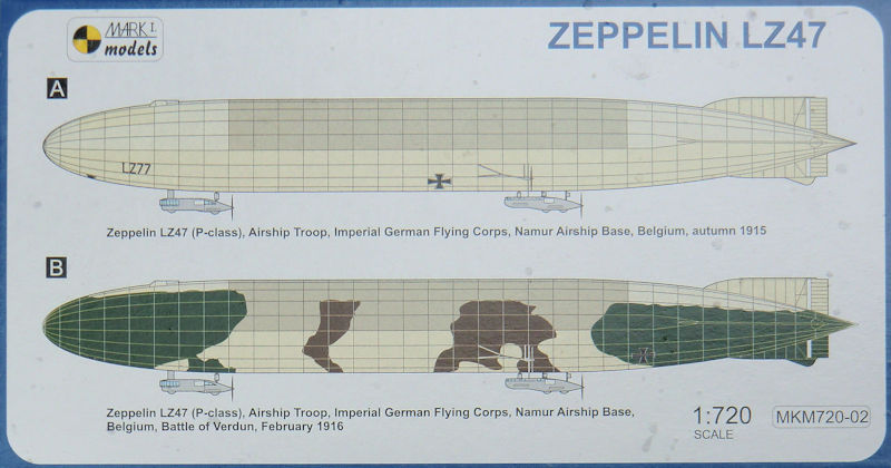 Bausatz: Im kleinen Maßstab 1/720 brachte MARK I models aus Tschechien eine Reihe von Zeppelin-Luftschiffen heraus. So freue ich mich hiermit auch das Luftschiff LZ47. In der attraktiven Schüttbox befinden sich gut verpackt ein beigefarbener Spritzling mit 39 Teilen, die beiden Rumpfhälften, ein Decalbogen die mehrfarbige Bau- und Bemalungsanleitung.