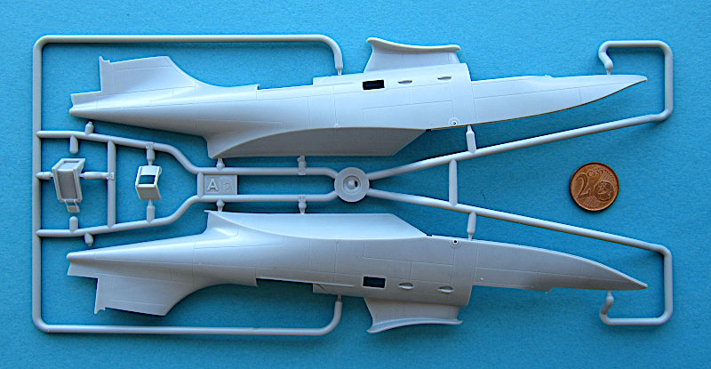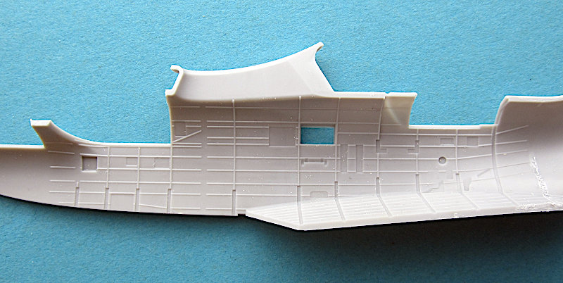 Der Rumpf hat im Cockpit und beim Abwehrstand eine komplette Inneneinrichtung. Wie gut diese wirklich ist, zeigt sich beim Bau. Die Materialstärken und Details gehören zum Feinsten, was ich in Spritzguss gesehen hab. Außerdem gibt es nur minimale Formtrennähte. Die Aufteilung ist ebenfalls wohl durchdacht. Das Cockpit wird auf der ersten Stufe des Bootsrumpfes aufgebaut, die Rumpfseitenteile haken in diese ein, so dass es einen wunderbaren Formschluss gibt. Der hintere Raum wird in die Rumpfhälften eingebaut. Diese bilden auch die zweite Stufe. Das Leitwerk ist separat auf den Rumpf zu kleben. Alle Steuerflächen sind ausgelenkt darstellbar!