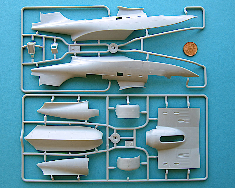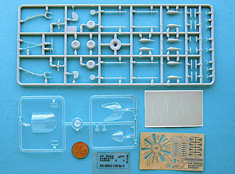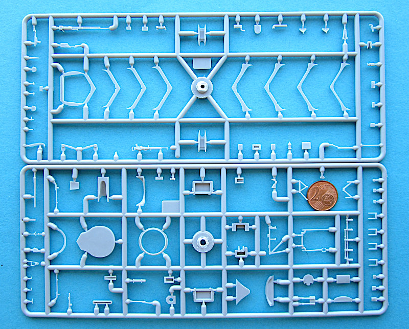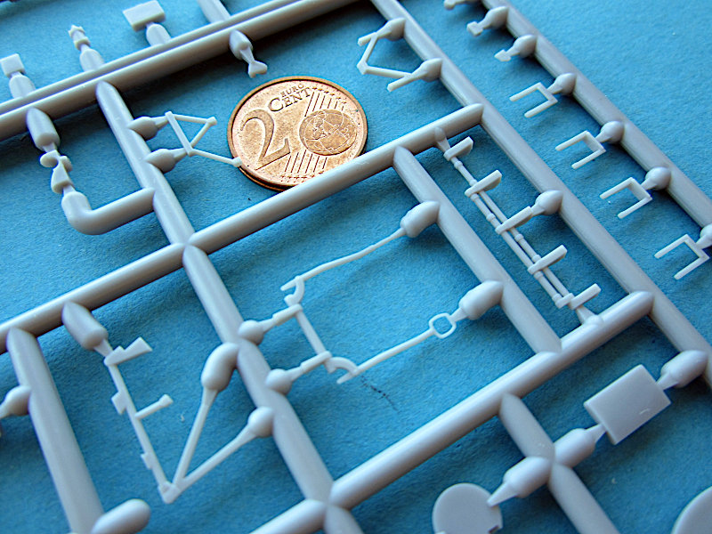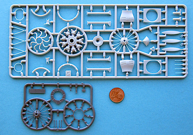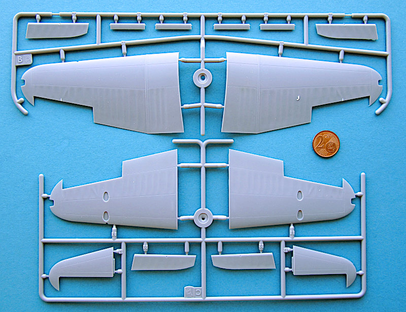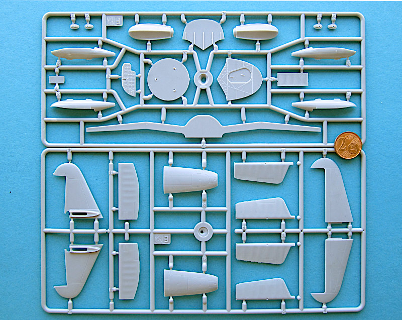 Im arg geschundenen Karton finden sich 10 graue und ein klarer Gießrahmen, eine Platine Fotoätzteile, ein Fotofilm für die Instrumente, Masken und Decals für 8 Luftfahrzeuge aus den 1940er Jahren. Im ersten Moment denkt man natürlich "typisch osteuropäischer Shortrun", aber nach der Erfahrung mit Wingsy Kits warf ich einen näheren Blick und war angenehm überrascht. Die Gießrahmen sind alle vergleichsweise klein (22 x 10-12 cm), So einen kleinere Spritzgießmaschine ist eben in der Anschaffung nicht so teuer. Die Qualität der Abspritzung ist aber sehr gut. Die Oberflächen sind glatt uns zeigen feine versenkte und gleichmäßig tiefe Gravuren. Eine Nietendarstellung gibt es nicht. Die beim Original stoffbespannten Flächen machen einen ganz guten Eindruck, auch wenn ein Vergleich mit einem Original sicher zeigen würde, das diese dort fast eben sind. Das wird bei jedem Modell so sein, 100% Maßstabstreue gibt das Original nicht unbedingt besser wieder…
