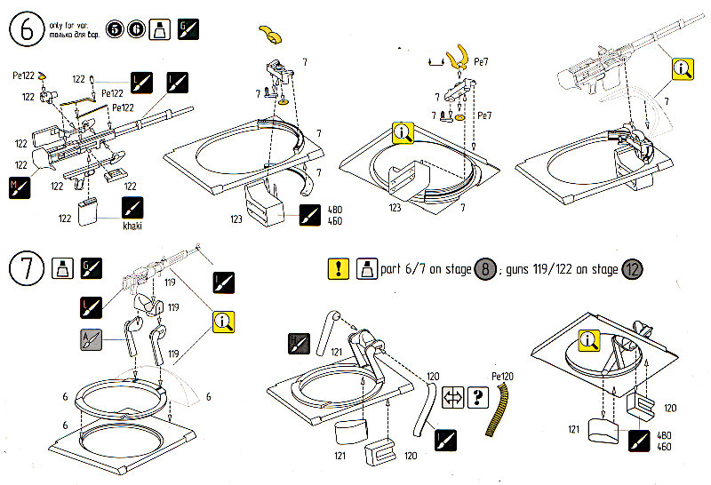 Die Darstellung der Farben im Bemalplan ist irreführen. Insbesondere die Unterseitenfarbe Gunze H324 ist eher ein Grau, bei AKAN ist A-28M ebenfalls ein grau mit leichtem beige Stich. Ich hab mich für Bemalungsvariante 3 entschieden… da kann man nicht soo viel falsch machen. Die Abziehbilder sind typisch für osteuropäische Hersteller. Die sehen auf dem Papier ganz o.k. aus, können aber unangenehm in der Verarbeitung sein. Sie sind jedenfalls im Register, d.h. ohne Versatz, gedruckt. Auf die Masken würde ich nicht unbedingt setzen. Mein Eindruck ist, das diese im günstigeren steifen Material von Oracover ausgeführt sind, welches dazu noch zur Schrumpfung neigt. Für die ebenen Flächen kann man diese mal ausprobieren. Ansonsten würde ich lieber auf das gelbe "Kabuki"-Tape ausweichen, das gibt's inzwischen auch im Baumarkt.