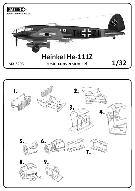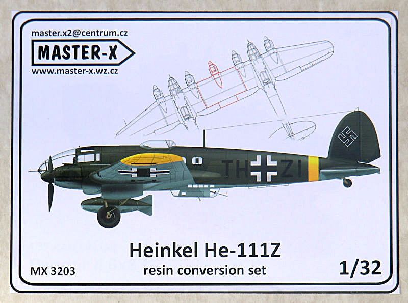 Bausatz: Master-X ist ein Label von Lumir Vesely aus Prag. Hier findet man diverse Bausätze und Umbausätze aus Resin. Zumeist hat man sich exotische Vorbilder ausgesucht. Hier gibt es einen Umbausatz für die Heinkel He 111H von Revell in 1/32! Dafür benötigt man natürlich zwei der Revell-Bausätze.