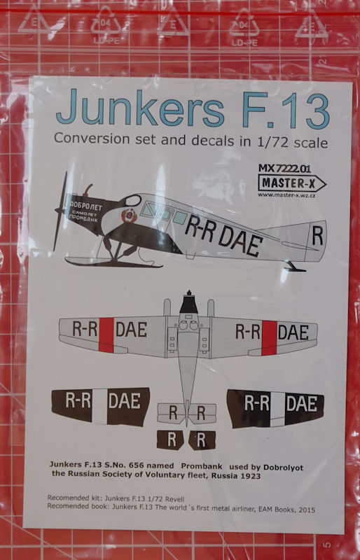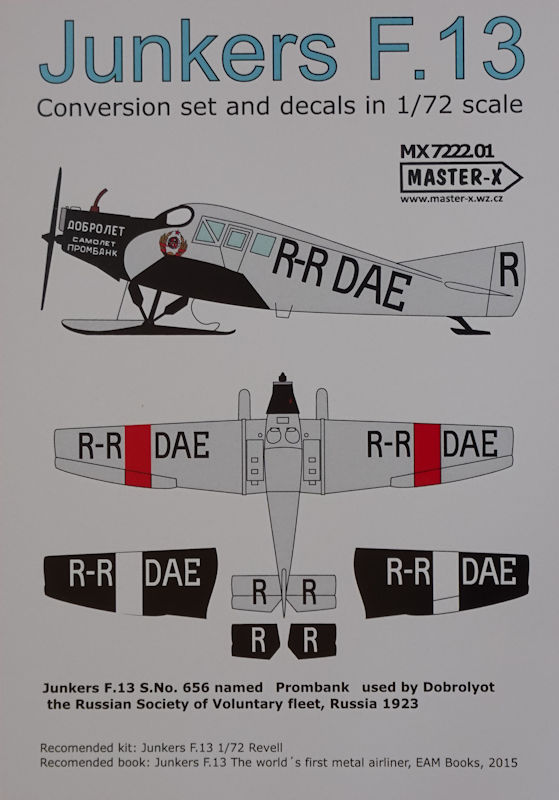 Weiterhin gibt es zwei neue Decalbögen. Dieser enthält alles was man für das Modell einer Junkers F.13 der DOBROLET benötigt. Auf einem mehrfarbigen Riss wird gezeigt wohin welches Decal gehört. Das Flugzeug war Naturmetall mit Schwarz und Rot abgesetzt.