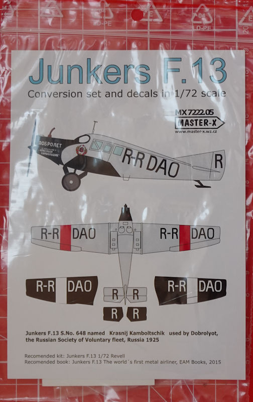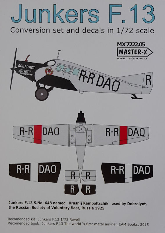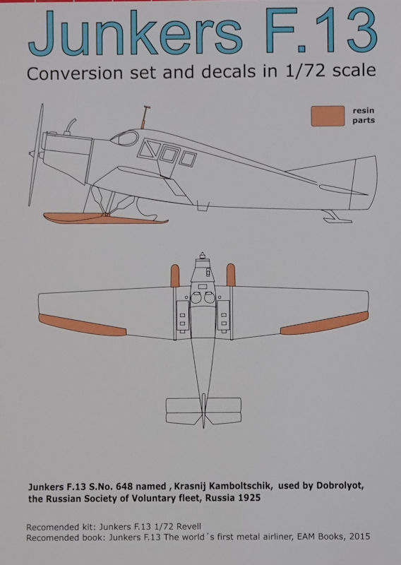 Die Ski sind offensichtlich als Bonusmaterial gedacht. Auf dem Cover ist das Vorbild mit Radfahrwerk zu sehen. Weiterhin gibt es einen neuen Decalbogen. Dieser enthält alles was man für das Modell einer Junkers F.13 der DOBROLET benötigt. Auf einem mehrfarbigen Riss wird gezeigt wohin welches Decal gehört. Das Flugzeug war Naturmetall mit Schwarz und Rot abgesetzt.