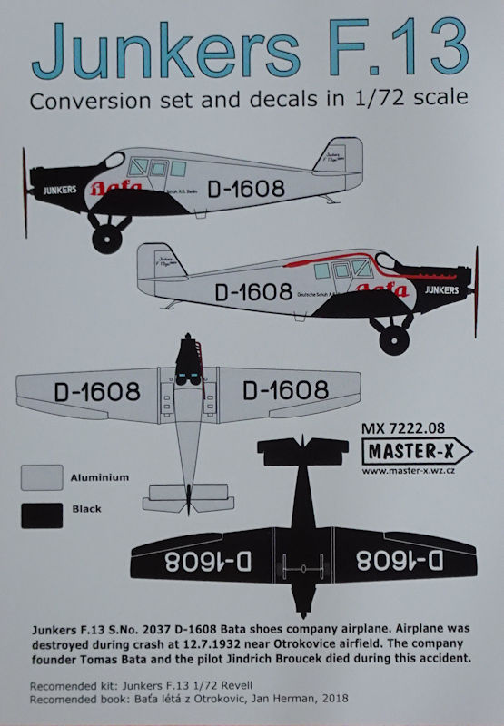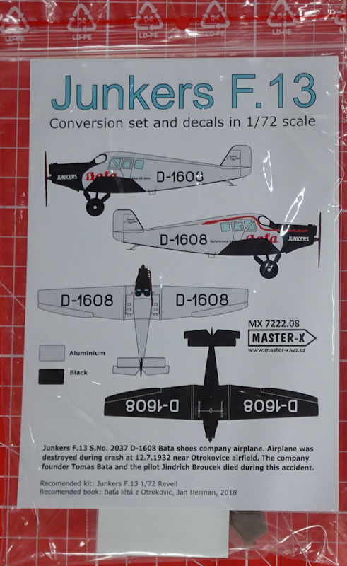Fazit: Eine sehr gute Idee hat hier Master-X erneut hervorragend umgesetzt. Dieses Umbauset ist auch für Einsteiger auf diesem Gebiet geeignet. Diese späte F.13 in 1/72 mit dem Bata-Schriftzug ist eine sehr willkommene Abwechslung!