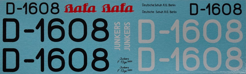 Weiterhin gibt es einen neuen Decalbogen. Dieser enthält alles was man für das Modell einer einer späten Junkers F.13 benötigt. Auf einem mehrfarbigen Riss wird gezeigt wohin welches Decal gehört. Das Flugzeug war Naturmetall mit Schwarz und einem rotem Bata-Schriftzug.