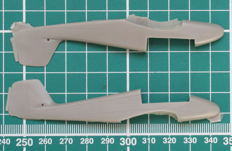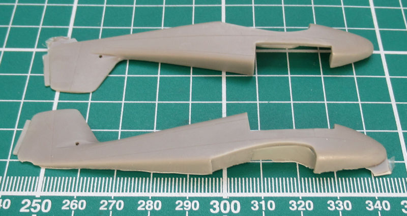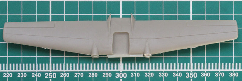 Die Tragfläche besteht aus einem Stück und die Motorgondeln sind anmodelliert. Selbst die richtige V-Stellung der Fläche ist gut getroffen. Scharfe Hinterkante an Fläche und Höhenleitwerks sind hier inklusive. Es gibt zwei verschiedene Luftschrauben. Hier sollte man die Fotos der Originale studieren.