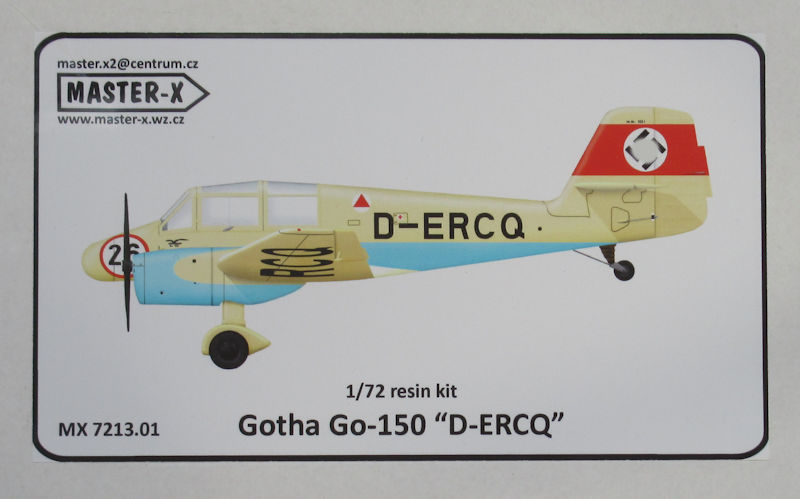 Bausatz: MASTER-X aus Tschechien hat diese zweimotorige Gotha Go 150 als Resinkomplettbausatz in 1/72 herausgebracht. Davon gibt es auch diverse Ausgaben mit verschiedenen Bemalungsvarianten.