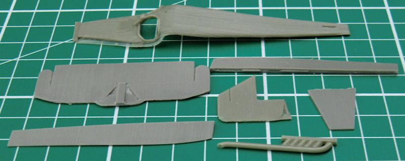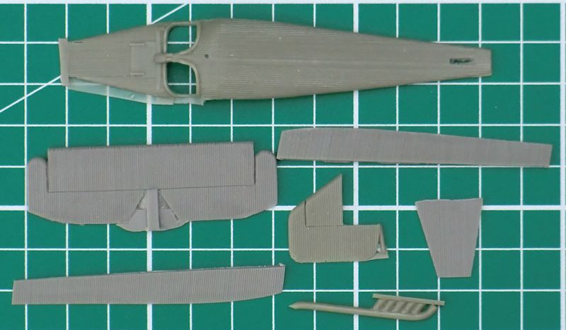In dem Zippbeutel befinden sich gut verpackt sieben sauber gegossene Resinteile. Diese ersetzen direkt die Bausatzteile. So gibt es ein neues oberes Rumpfteil, zwei neue Querruder, ein komplettes Höhenleitwerk, ein spätes Seitenleitwerk, ein Motorunterteil und einen Abgassammler.