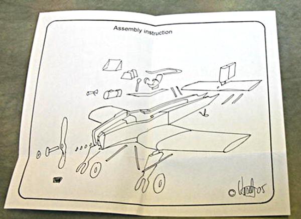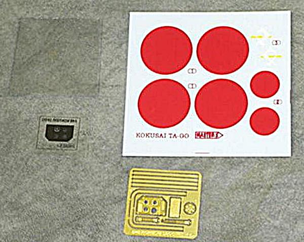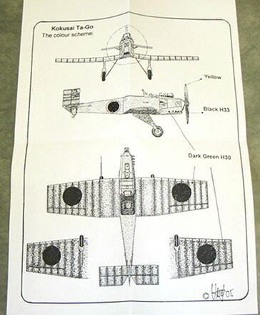 Ein DIN A5-Blatt mit einer handgezeichneten Explosionsdarstellung dient als Bauanleitung, ein weiterer mit einer 5-Seiten-Ansicht gibt die Bemalung (IJA-Grün über alles) und die Position der Abzeichen an.