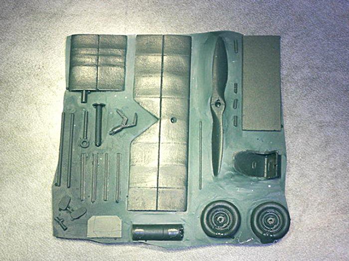 Der Bausatz , der auf 100 Exemplare limitiert ist, präsentiert sich in einem stabilen Faltkarton mit einer Schwarzweißzeichnung des Vorbildes. Die Hauptkomponenten sind sehr sauber in dunkelgrünem Resin gegossen und in mehrere Plastiktüten eingeschweißt. Der Rumpf ist in zwei Hälften hohl gegossen, so dass der Cockpiteinbau keine Probleme darstellen dürfte. Die Kleinteile haben die übliche Fischhaut und leider einige Blasen, die gefüllt werden müssen. Die Fahrwerkbeine liegen, wohl aus Stabilitätsgründen in Weißmetall gegossen in einer separaten Tüte bei, auch hier gilt es einige Bläschen zu füllen. Für das Cockpit, die Gurte, die Fahrwerksstreben und die Propellernabe findet sich ein kleiner Ätzteilerahmen. Die Instrumente können mit dem mitgelieferten Film dargestellt werden und für die Windschutzscheibe findet sich ein kleiner Bogen Klarsichtmaterial zum Selbstzuschneiden. Alle für die einzige gebaute Maschine benötigten Abzeichen liegen auf einem sehr sauber gedruckten Decalbogen bei.