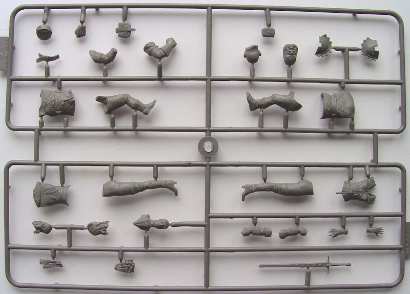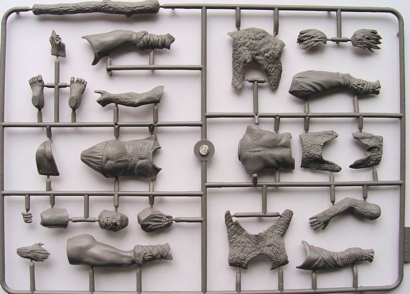 Das Deckbild ist sehr schön gestaltet. Es zeigt eine komplette Szene. Im Bausatz befinden sich 2 kleine Spritzrahmen im A5-Format. Verwendet wurde ein grauer -gut zu verarbeitender- Kunststoff. Die Spritzrahmen sind sauber gegossen, kaum Grat.
