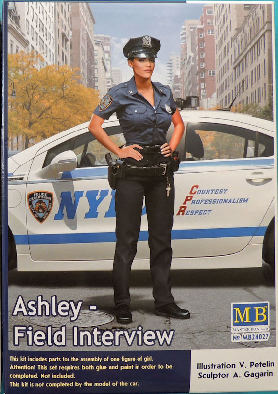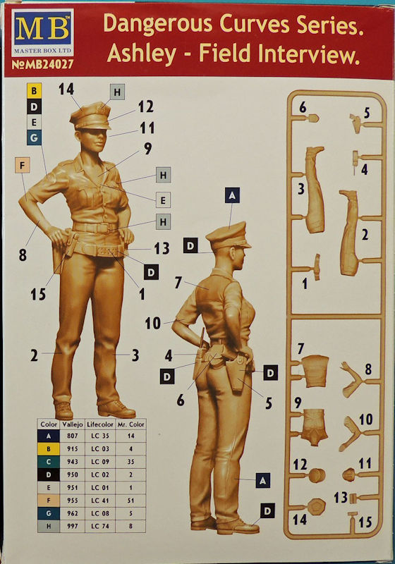 Eine Bauanleitung gibt es nicht, stattdessen eine 3D Darstellung der unbemalten Figur auf der Rückseite der Box. Hier findet man auch passende Farbangaben zur Bemalung für die Systeme Vallejo, Lifecolor und Mr.Color. Natürlich kann man Ashley auch in die Uniform einer anderen Stadt stecken, der Fantasie des Bastlers sind hier keine Grenzen gesetzt. Bei diesem Modell wären vielleicht ein paar Decals für die Uniformpatches schön gewesen aber ich denke, da gibt es bestimmt bald etwas passendes auf dem Zubehörsektor im Internet. Die Verpackung in Form einer Schüttbox ist meines Erachtens etwas zu groß für den kleinen Rahmen, dadurch klappert er im Inneren hin und her.