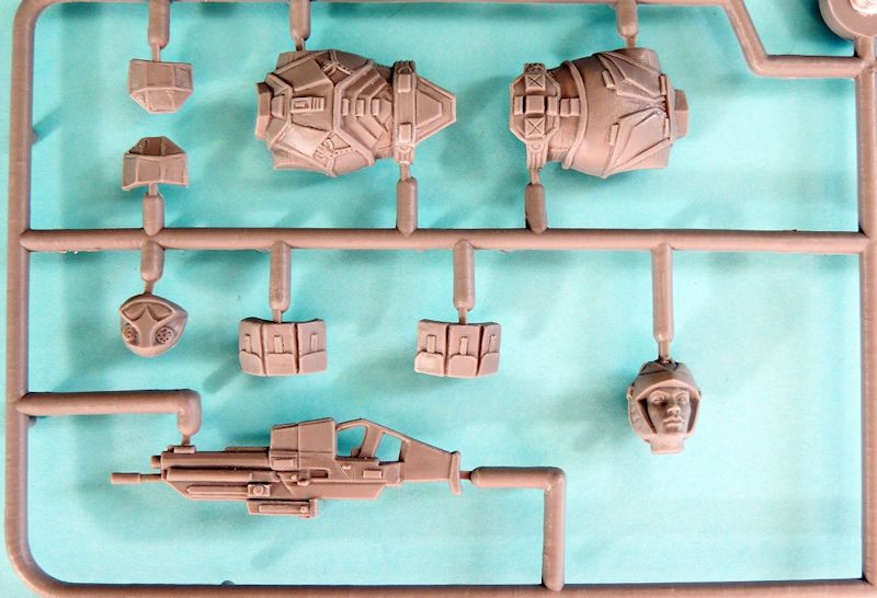 Der Karton enthält einen einzelnen hellgrauen Spritzling mit insgesamt 18 Teilen. Gussnähte sind einige vorhanden und diese fallen auch etwas stärker aus. Gut finde ich, dass das Visier des Helmes separat beiliegt. So hat man die Möglichkeit auch das Gesicht zu bemalen und das Visier eventuell hochgeklappt darzustellen.