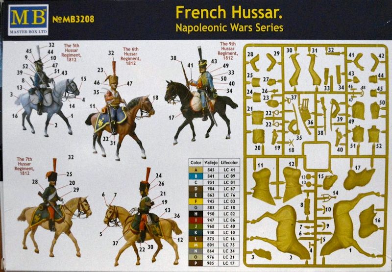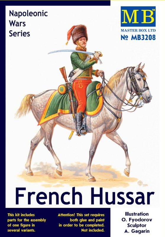 Bausatz: Master Box kündigte bereits vor einiger Zeit drei Figurenbausätze aus der Napoleonischen Ära im Maßstab 1:32 / 54 mm. Da man von dieser Firma bisher nur Figuren aus den Weltkriegen oder moderneren Epochen kannte, hat mich die Nachricht besonders gefreut. Als eine der ersten Figuren erschien der Husar zu Pferd.