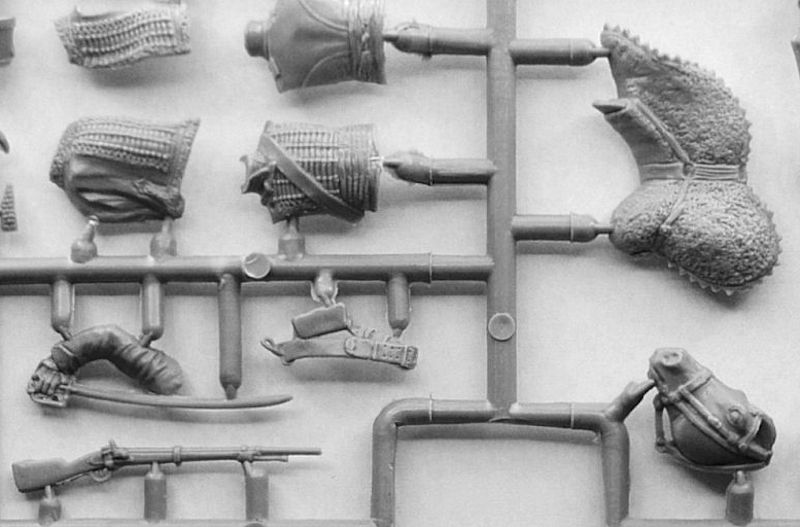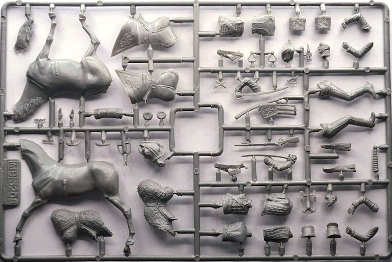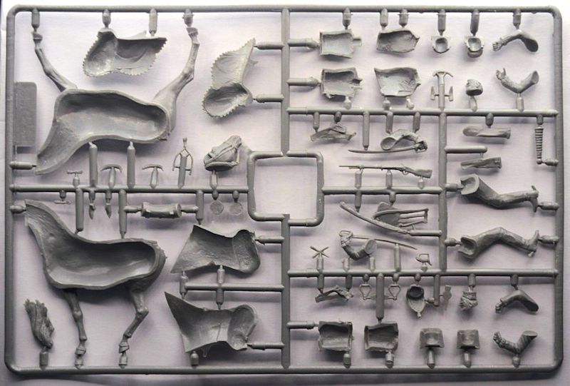 Der Bausatz bietet in einer recht großen Schüttbox einen Spritzling mit 54 Teilen aus grauem Plaste für einen Reiter mit Pferd! Qualitativ sind diese auf einem hohen Niveau gehalten. Es gibt keine Auswerferstellen an den Bauteilen und auch Senkstellen halten sich stark in Grenzen. Lediglich leichte Unebenheiten auf den Oberflächen erfordern etwas Spachtelmasse. Außerdem haben fast alle Teile leichte Fischhäute, was gerade bei schmal gegossenen Teilen mehr Nacharbeit erfordert. Das Pferd hat keine Fellstruktur, diese kann man gegebenenfalls selber darstellen. Trotzdem ist die Detaillierung für Plaste sehr anspruchsvoll. Die vorhandenen Felle, z.B. auf der Schabracke oder den Pelzmützen, oder auch die Verschnürungen der Jacken wissen sehr zu gefallen. Kompliziertere Stellen wurden mehrfach aufgeteilt, um sie trotz Spritzguss anständig dreidimensional zu detaillieren. Die Zügel und Gewehrriemen sind nicht im Bausatz enthalten, lassen sich aber leicht aus Metallfolie oder Ähnlichem ergänzen.